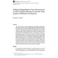 universities and aims to sensitize debates around this highly neglected issue. My primary goal is not only to challenge arbitrary policy, but also to produce a useful sociological framework capable of enabling Africans to participate in their own educational development wherever they may choose to study. This paper targets African curriculum policy-makers and stakeholders and by focusing on the differential fee regimes, it is possible to show how such policy impinges upon current discourse on the Africanisation of higher education curriculum in very complex and subtle ways. Without disregarding recent efforts, however, I want to suggest that promoting an all-inclusive higher education environment within Africa without a single unified tuition policy negates all efforts toward an African curriculum agenda. An example is drawn from the thinking of the Bologna Process and the challenges such development presents to the African continent. The paper concludes that until differential policy regimes within African tertiary institutons are included on the agenda of various efforts toward the harmonization of African higher education, the journey towards a true Africanised, decolonized and allinclusive education curricula for Africans may remain a mirage. - Publisher