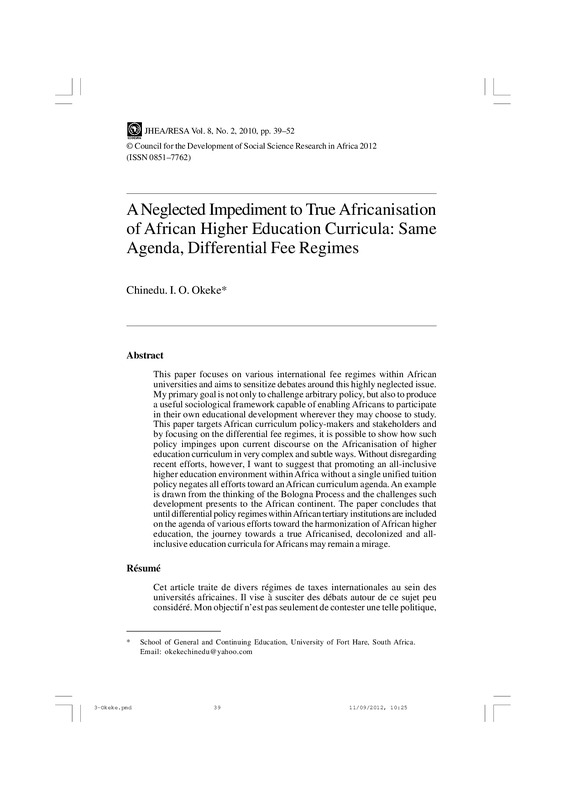 ItemA neglected impediment to true Africanisation of African higher education curricula: Same Agenda; different fee regimes.This paper focuses on various international fee regimes within African universities and aims to sensitize debates around this highly neglected issue. My primary goal is not only to challenge arbitrary policy, but also to produce a useful sociological framework capable of enabling Africans to participate in their own educational development wherever they may choose to study. This paper targets African curriculum policy-makers and stakeholders and by focusing on the differential fee regimes, it is possible to show how such policy impinges upon current discourse on the Africanisation of higher education curriculum in very complex and subtle ways. Without disregarding recent efforts, however, I want to suggest that promoting an all-inclusive higher education environment within Africa without a single unified tuition policy negates all efforts toward an African curriculum agenda. An example is drawn from the thinking of the Bologna Process and the challenges such development presents to the African continent. The paper concludes that until differential policy regimes within African tertiary institutons are included on the agenda of various efforts toward the harmonization of African higher education, the journey towards a true Africanised, decolonized and allinclusive education curricula for Africans may remain a mirage.